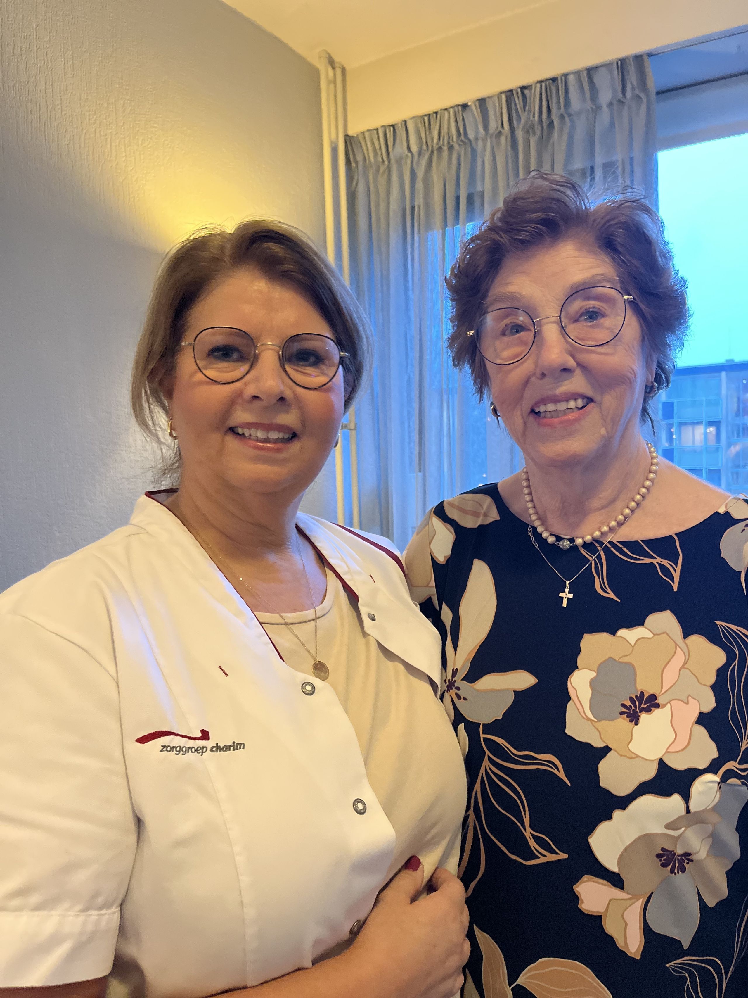‘Ik besprak dit met een vriendin. Zij had ook wel interesse om de zorg in te gaan. Samen gingen we uitzoeken of dit mogelijk was. We waren inmiddels wel ruim vijftig jaar, dus konden we nog wel een overstap maken, en zo ja, hoe dan? Tijdens een open dag ontdekte ik de kans om werken en leren te combineren via een leerlingentraject. Mijn oog viel op de verkorte BBL-opleiding voor Helpende Plus, een opleiding van negen maanden in plaats van de reguliere twee jaar. Met een open sollicitatie klopte ik bij Charim aan en in dat najaar, inmiddels drie jaar geleden, kon ik starten als leerling in De Engelenburgh. Als ik jonger was geweest, had ik doorgeleerd voor de functie Verzorgende IG, maar een studie van ongeveer 2,5 jaar zie ik niet meer zitten. Ik ben superblij met mijn functie en de stap naar de ouderenzorg!’